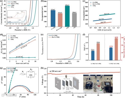 2.本征活性:ECSA归一化后Ru–Co-THQ显著优于Co-THQ;TOF和质量活性均翻倍(图3d-f)。