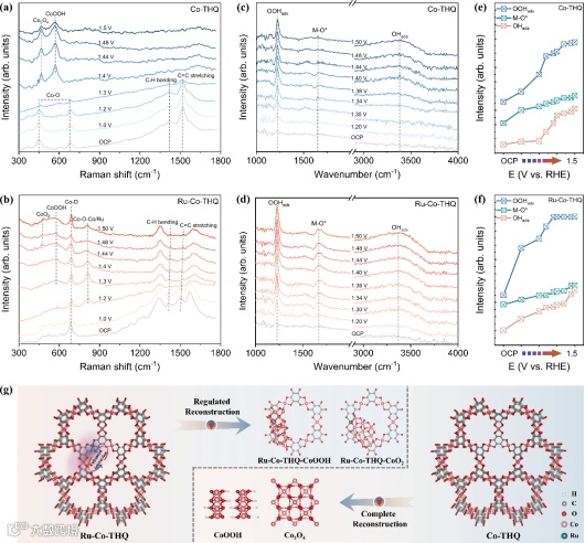 1.原位Raman:Co-THQ在高电位下迅速转化为Co3O4/CoOOH;Ru–Co-THQ在OER过程中MOF特征峰始终保持,且在较低电位下形成高价CoOOH/CoO2活性物质,Ru的引入有效调控了催化剂的结构转变(图4a-b)。