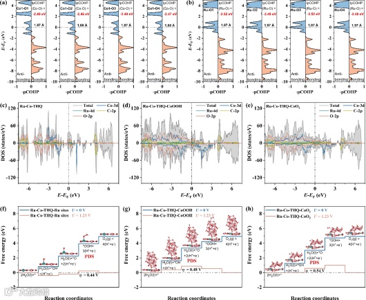 2.PDOS:Ru 4d、Co 3d、O 2p轨道在费米能级附近强耦合并重排,平衡含氧中间体吸附并提高导电性(图5c-e)。