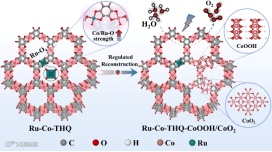 通过在二维导电MOF(Co-THQ)中引入原子分散的Ru,增强Co/Ru–O键相互作用,显著抑制了在碱性OER条件下金属有机框架的快速坍塌,有效调控了催化剂的结构转变,并促进了高价Co活性物种的生成,实现了活性与稳定性的同时提升。