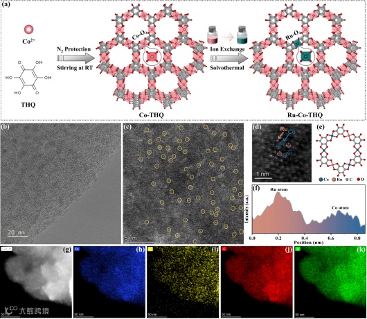 3.原子分散:HAADF-STEM和EDX映射揭示Ru原子在Co-THQ骨架中均匀分散并与Co近邻(图1c-k)。