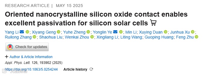 Li, Y., Geng, X., Zheng, Y. et al. Oriented nanocrystalline silicon oxide contact enables excellent passivation for silicon solar cells. Appl. Phys. Lett. 12 May 2025; 126 (19): 193902. https://doi.org/10.1063/5.0254244。