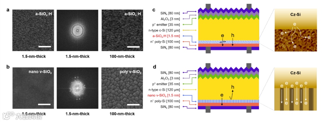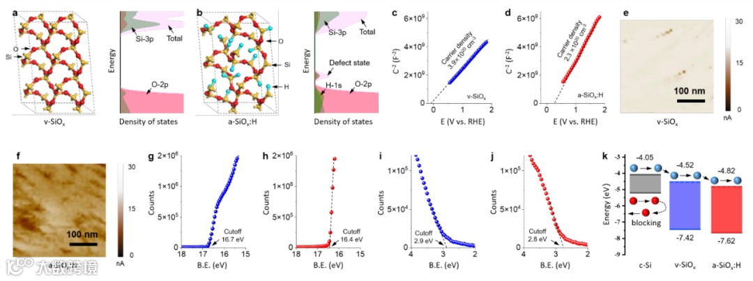 在理论研究的基础上,将TEOS与无水乙醇按照一定的比例混合,室温环境下搅拌均匀,以一定的速率旋涂至c-Si基底表面,并在空气气氛下进行退火处理,得到沿垂直方向生长的SiOx(v-SiOx),SCI法得到的v-SiOx钝化触点实现了优异的表界面钝化和电子选择性传输,使得有效载流子寿命(τeff)从a-SiOx:H的2.5 ms增加到v-SiOx的3.0 ms。图3a和3b的DFT模拟结果可以进一步解释a-SiOx:H和v-SiOx在钝化性能和有效载流子寿命方面的差异。同时,纳米晶v-SiOx表现出更强的n型半导体性能和更低的电阻率。此外,我们还通过无接触激光转印(LTP)来沉积低遮光面积的栅线,最终制备的TOPCon太阳能电池的开路电压(VOC)达到了746 mV,高于a-SiOx:H钝化的TOPCon太阳能电池的743.8 mV;短路电流(JSC)相比于a-SiOx:H钝化的TOPCon电池增加了0.13 mA cm−2,达到了41.54 mAcm−2;并且v-SiOx钝化的TOPCon太阳能电池具有更高的填充因子(84%)和更高的光电转换效率(26.01%)。
