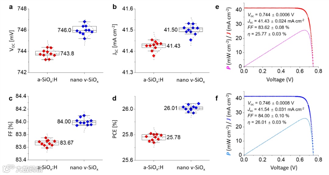 本工作提出的溶胶结晶诱导(SCI)法可以在c-Si表面上生长致密、缺陷少、垂直取向的SiOx(v-SiOx)钝化触点。与a-SiOx:H相比,v-SiOx具有更高的载流子浓度和垂直导电性,能够在c-Si表面形成高效的电子选择性传导触点。通过优化v-SiOx纳米晶触点,隧道氧化物钝化接触(TOPCon)太阳能电池实现了26.01%的光电转换效率(PCE),开路电压(VOC)达到了746 mV,填充因子(FF)为84%,短路电流密度(JSC)可达41.54 mAcm−2。