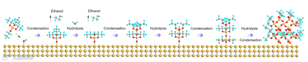 为了得到表面致密、缺陷少、垂直取向的SiOx(v-SiOx)钝化触点,团队首先研究了v-SiOx具体的微观生长过程。当使用CVD方法生长SiOx时,由于前驱体气体中含有丰富的氢,很容易导致钝化接触中残留大量的氢。在后续加工或发电过程中,氢原子可能脱氢,从而影响结构稳定性和器件的输出性能。本工作开创性的提出了一种SCI法,以硅酸四乙酯(TEOS)为前驱体配置溶胶,将TEOS溶胶旋涂在c-Si表面后,TEOS分子与硅羟基(-Si-OH)缩合,并在c-Si表面接枝-O-Si-(OR)3 (R =CH2-CH3)种子,接枝的-O-Si-(OR)3种子在环境中与水分子发生水解反应;随后,水解的-O-Si-OH(OR)2与其他TEOS分子缩合,形成链式反应。随着-Si-O-Si-单元的不断加长,SiOx中间体有序向上生长。同时,随着支链上水解缩合反应的进行,逐渐形成v-SiOx纳米晶钝化触点。