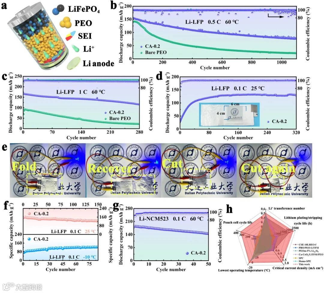图5. Bare PEO和CA-0.2电解质在不同条件下全电池的电化学性能。a) LFP全电池结构示意图。b, c) 60 °C下Li-LFP电池在0.5 C和1 C倍率下的长循环性能。d) 25 °C下Li-LFP软包电池在0.1 C倍率下的循环性能。e) Li-LFP软包电池的滥用测试。f) 25 °C和−10 °C下Li-LFP电池在0.1 C倍率下的循环性能。g) 60 °C下Li-NCM 523电池在0.1 C倍率下的循环性能。h) CA-0.2与其他工作的电化学性能对比。