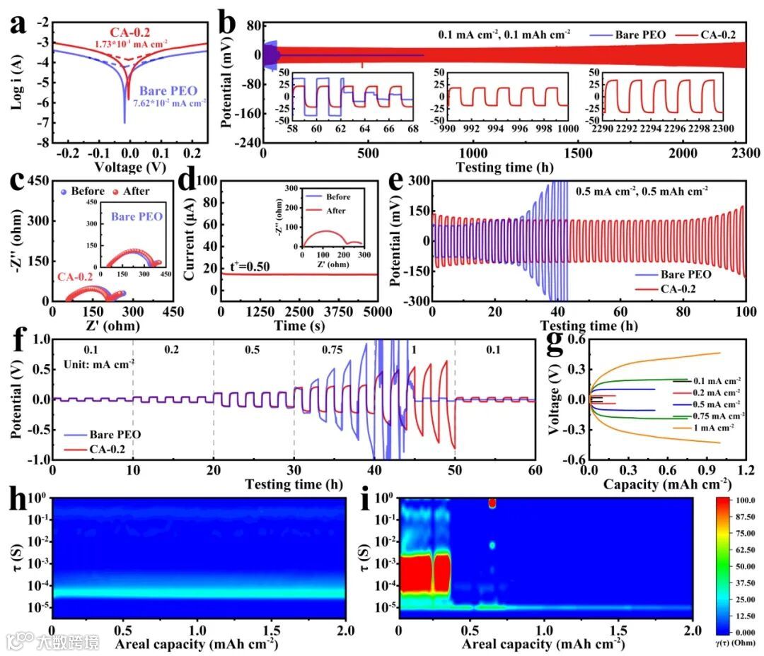 图4. 60 °C下Li-Li对称电池的循环性能。a) 塔菲尔曲线及交换电流密度。b) 在0.1 mA cm⁻²电流密度和0.1 mAh cm⁻²容量下,CA-0.2和Bare PEO Li-Li对称电池的长循环性能。c) 循环前后的EIS谱图。d) CA-0.2的直流极化分布。e) 在0.5 mA cm⁻²电流密度和0.5 mAh cm⁻²容量下的循环稳定性。f) 电流密度从0.1 mA cm⁻²增至1 mA cm⁻²、容量从0.1增至1 mAh cm⁻²的倍率性能测试。g) 不同电流密度下的充放电曲线。h, i) 锂沉积/剥离过程的原位DRT分析图。