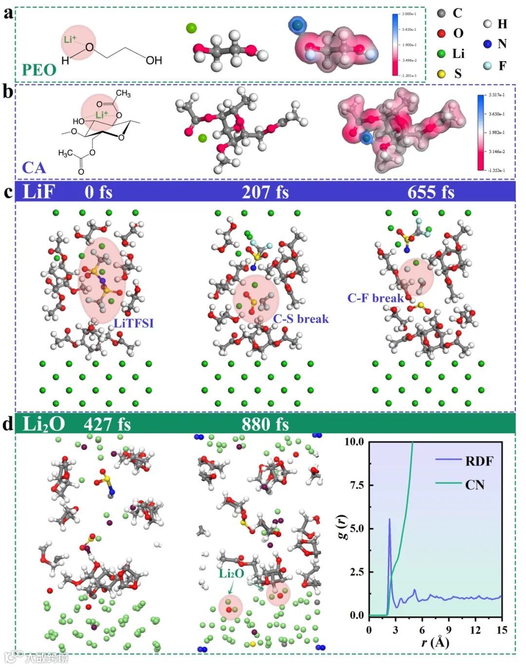 图1. DFT和AIMD计算结果。a) PEO模型和b) CA模型的化学结构、分子模型及电荷分布。c, d) 通过AIMD模拟的CA-0.2中LiF和Li2O的形成机制。
