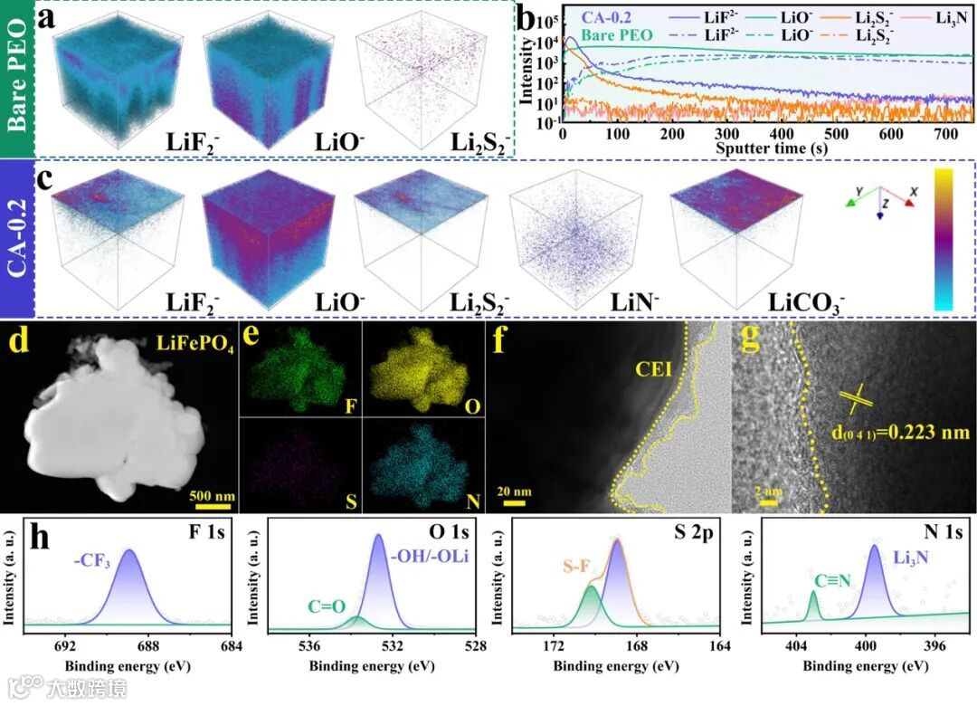 图3. a, c) 使用CA-0.2和Bare PEO的Li-Li对称电池循环30次后锂电极溅射出的二次离子碎片的3D可视化图。b) 关键SEI组分随溅射时间的变化。d–g) CA-0.2中循环后LFP阴极粉末的TEM图像、元素分布及高分辨TEM表征。h) CA-0.2中循环后LFP阴极的XPS谱图。