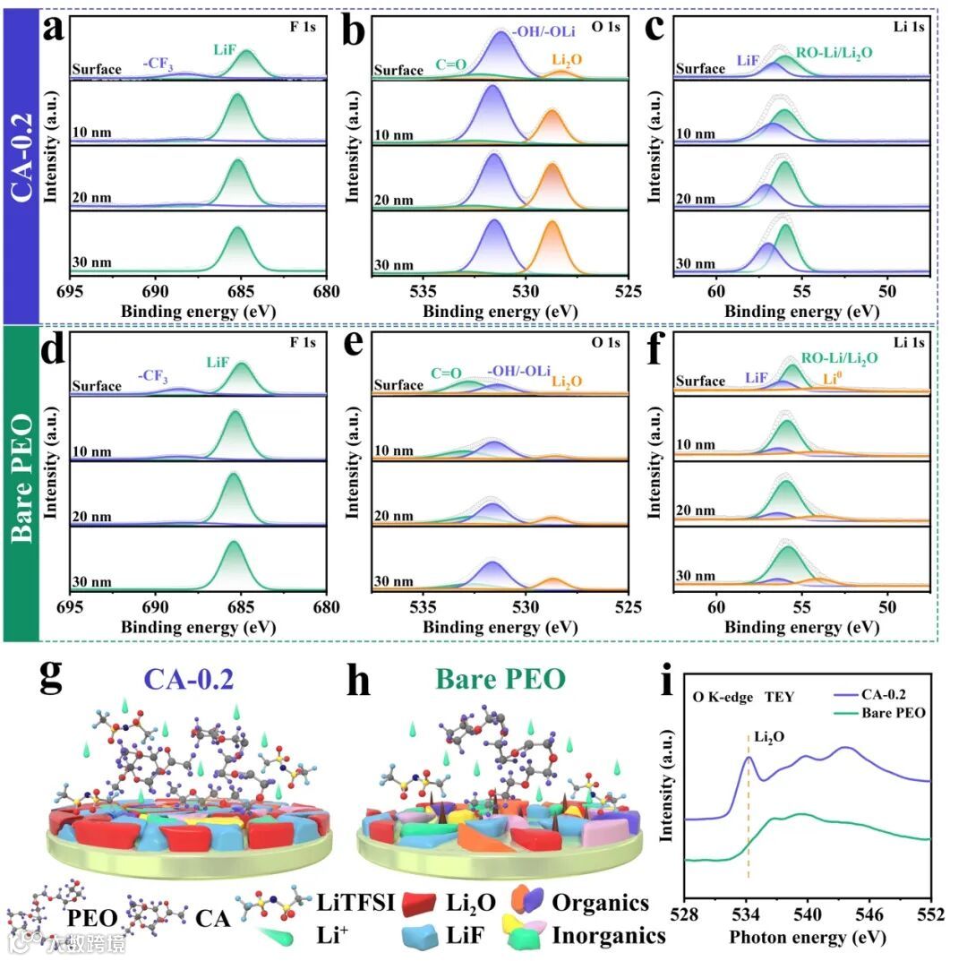 图2. a–c) CA-0.2和d–f) Bare PEO在溅射深度为0、10、20和30 nm后的F 1s、O 1s和Li 1s高分辨XPS谱图。g, h) CA-0.2和Bare PEO中SEI的示意图。i) 采用Bare PEO和CA-0.2电解质的循环后锂阳极在TEY模式下的O K-edge XAS谱。