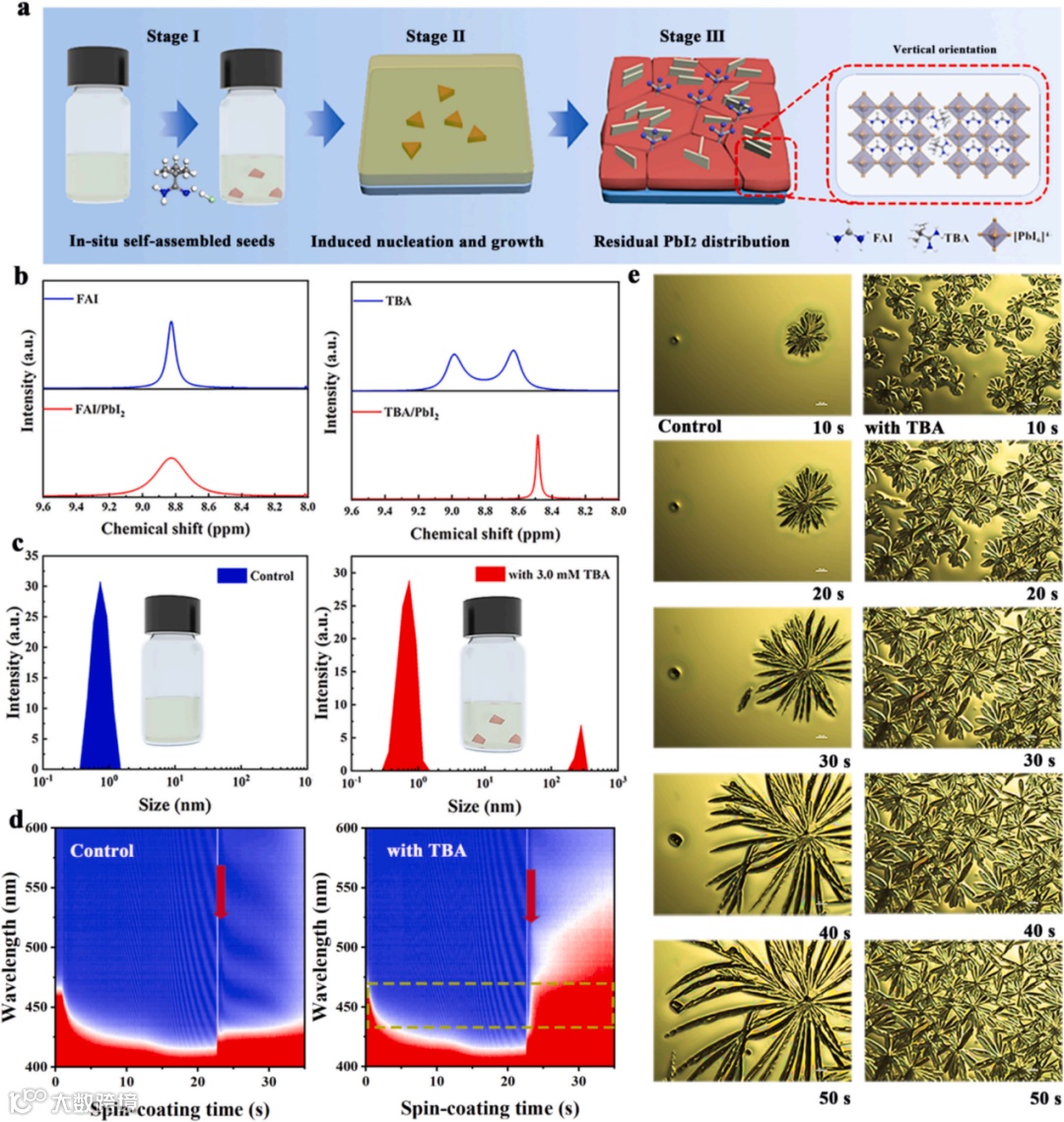 图1.(a)钙钛矿薄膜制备碘化铅全方位管理的示意图。(b)FAI和FAI+碘化铅、TBA及TBA+碘化铅的核磁谱图。(c)前驱体溶液经TBA处理与未处理的DLS谱图。插图为前驱体溶液的示意图。(d)未处理与经TBA处理钙钛矿薄膜的原位UV–vis吸收光谱。箭头指示反溶剂滴落时间。(e)未经处理与经TBA处理的钙钛矿薄膜成核过程的光学显微镜图像。