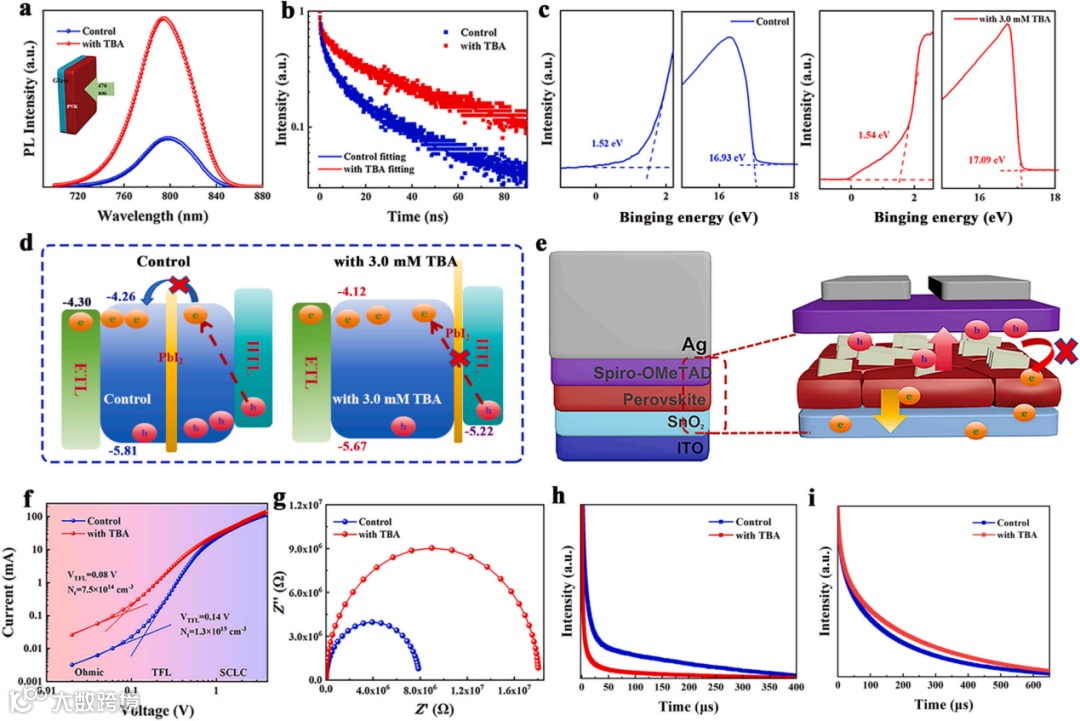图4. (a)玻璃基底上未处理与经TBA处理的钙钛矿层稳态光致发光光谱及(b)TRPL光谱。(c)未处理与经TBA处理钙钛矿薄膜的UPS光谱。(d)未处理与经TBA处理器件的能带图。(e)制备器件结构示意图及其对应的载流子传输过程示意图。(f)未处理与经TBA处理器件的SCLC曲线、(g)Nyquist图、(h)TPC曲线及(i)TPV曲线。