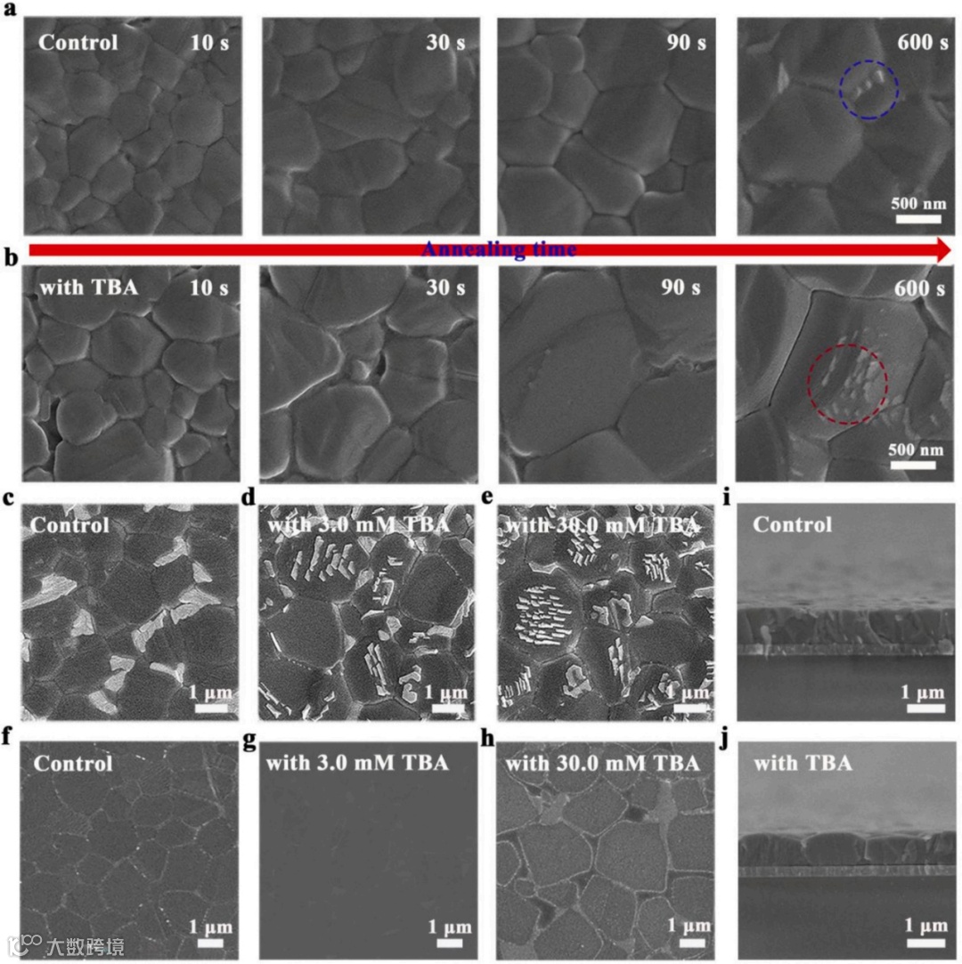 图2.(a–b)未经处理与经TBA处理的钙钛矿薄膜在不同退火时间后的俯视SEM图像。(c–e)表面形貌(顶部),(f–h)底部界面形貌,(i–j)未经处理与经TBA处理的钙钛矿薄膜的横截面图像。