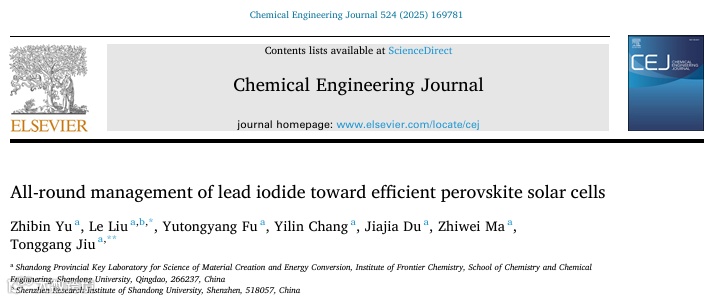近日,来自山东大学的刘乐副教授与酒同钢教授,在国际知名期刊Chemical Engineering Journal上发表题为“All-round management of lead iodide toward efficient perovskite solar cells”的观点文章。该文章通过引入添加剂(叔丁基甲脒盐酸盐),解决了钙钛矿不受控的结晶过程,同时优化了钙钛矿薄膜中残余碘化铅的空间分布,实现了正式25.08%与反式26.26%的钙钛矿器件效率。为管理钙钛矿薄膜结晶过程以及残余碘化铅提供了新的思路。