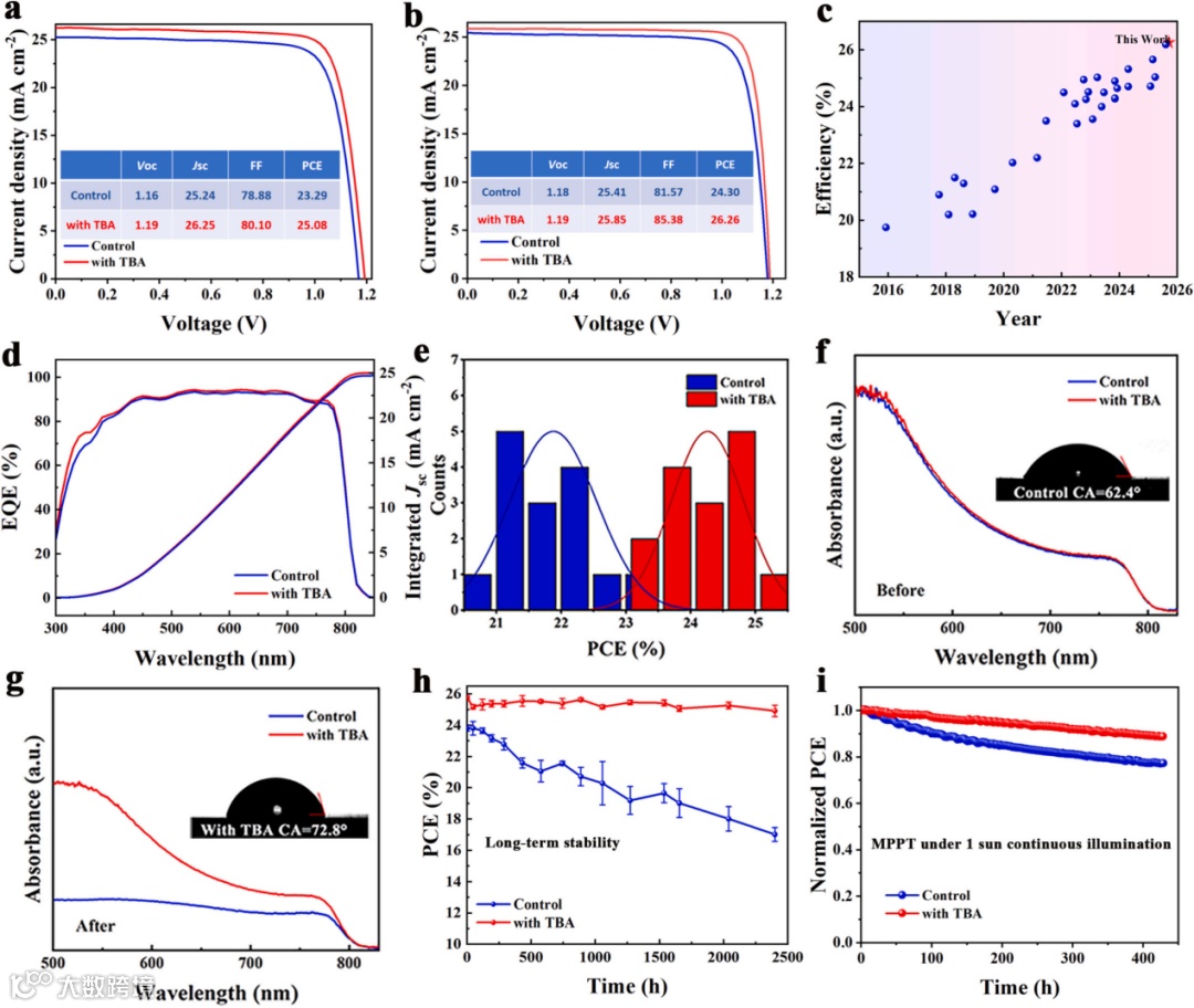 图5. (a)n-i-p器件与(b)p-i-n器件经TBA处理与未处理的J-V曲线。(c)过去十年采用碘化铅管理策略报告的光电转换效率(PCE)对比。(d)n-i-p器件的EQE光谱及对应的积分电流密度曲线。(e)TBA未处理与TBA处理器件的PCE分布统计直方图。(f-g)钙钛矿薄膜在70%相对湿度(RH)下储存24小时后的UV-Vis吸收光谱。插图显示钙钛矿薄膜的水接触角。(h)未封装p-i-n器件经TBA修饰与未修饰的长期稳定性。(i)对照组与目标器件的MPP跟踪稳定性测试。