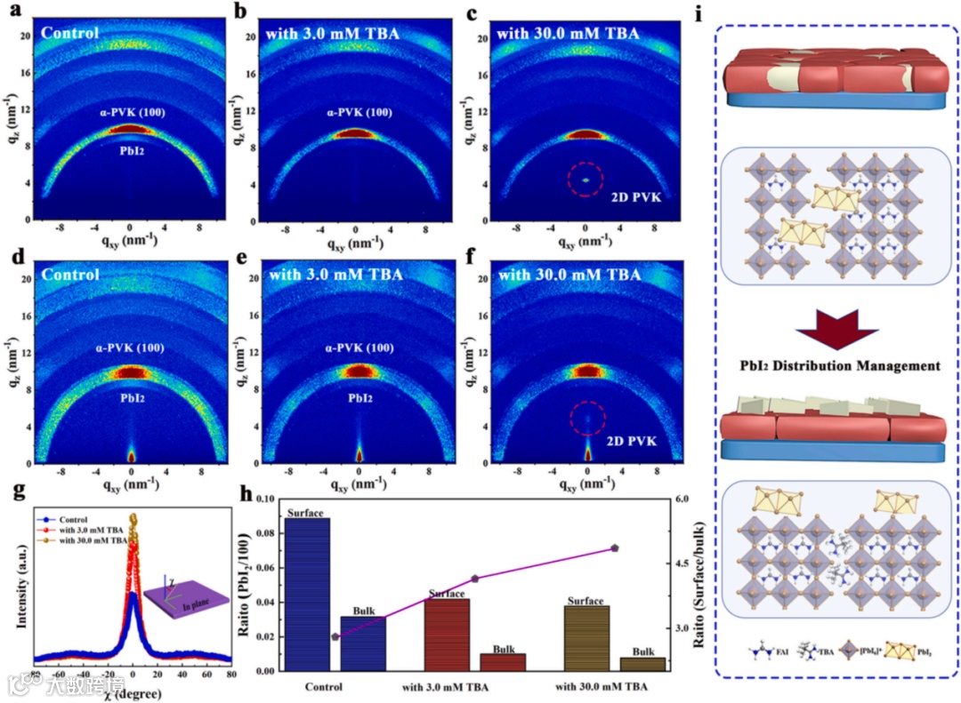 图3.(a-f)未处理和经TBA处理的钙钛矿薄膜在3.5°和0.8°入射角下的GIWAXS图案。(g)控制组和经TBA处理组沿(100)晶面(q=10 nm⁻¹)的方位积分信号强度。(h)未处理和经TBA处理的钙钛矿薄膜中碘化铅/(100)及表面/体分布的碘化铅强度比。(i)碘化铅全方位管理示意图。