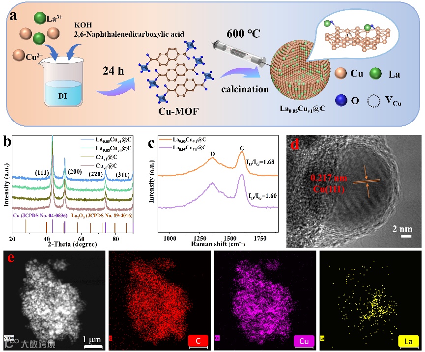 图1. a) La0.05Cuv1@C的合成路径;b) La0.05Cuv1@C、La0.05Cuv0@C、Cuv1@C和Cuv0@C的XRD图谱;c) La0.05Cuv1@C和La0.05Cuv0@C的拉曼光谱;d) La0.05Cuv1@C的高分辨透射电镜图;e) La0.05Cuv1@C的EDS元素分布图。