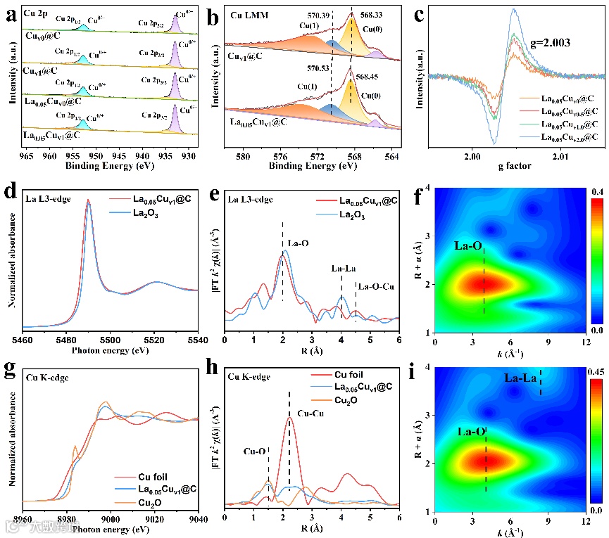 图2. a) La0.05Cuv1@C、La0.05Cuv0@C、Cuv1@C和Cuv0@C的Cu 2p XPS谱;b) La0.05Cuv1@C和Cuv1@C的Cu LMM谱;c) La0.05Cuv2@C、La0.05Cuv1@C、La0.05Cuv0.5@C和La0.05Cuv0@C的EPR谱;d) La L3边XANES谱;e) La0.05Cuv1@C的La L3边FT-EXAFS谱;f) La0.05Cuv1@C中La的WT-EXAFS图;g) Cu K边XANES谱;h) La0.05Cuv1@C的Cu K边FT-EXAFS谱;i) La2O3中La的WT-EXAFS图。