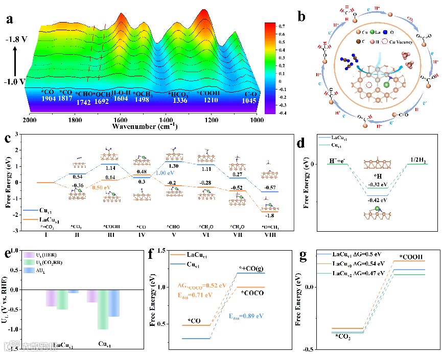 图4. a) La0.05Cuv1@C的原位ATR-FTIR光谱;b) La0.05Cuv1@C的反应路径示意图;c) Cuv1和LaCuv1上CO2还原为CH4的自由能图;d) H2自由能分布图;e) Cuv1和LaCuv1的UL(HER)、UL(CO2RR)及ΔUL;f) LaCuv1上CO二聚为COCO的吉布斯自由能图及CO脱附能;g) LaCuv1、LaCuv0和LaCuv2上CO2加氢生成COOH的吉布斯自由能图。