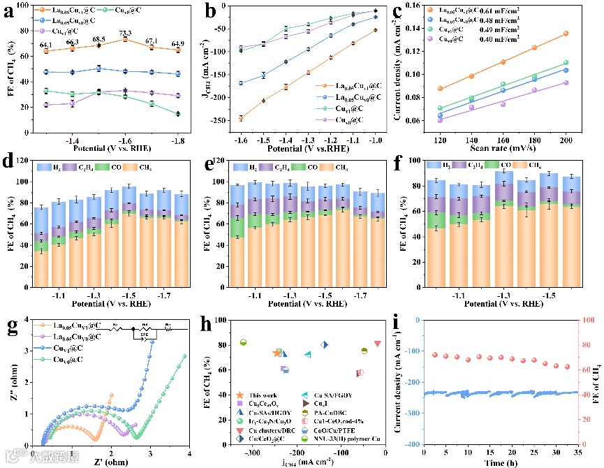 图3. a) La0.05Cuv1@C、La0.05Cuv0@C、Cuv1@C和Cuv0@C的CH4法拉第效率;b) La0.05Cuv1@C、La0.05Cuv0@C、Cuv1@C和Cuv0@C的CH4分电流密度对比;c) La0.05Cuv1@C、La0.05Cuv0@C、Cuv1@C和Cuv0@C的双电层电容;d) La0.05Cuv0.5@C产物的法拉第效率分布;e) La0.05Cuv1@C产物的法拉第效率分布;f) La0.05Cuv2@C产物的法拉第效率分布;g) La0.05Cuv1@C、La0.05Cuv0@C、Cuv1@C和Cuv0@C的奈奎斯特图;h) 不同电催化剂的CH4电流密度与法拉第效率对比;i) La0.05Cuv1@C在-1.6 V(vs. RHE)电位下的稳定性测试。