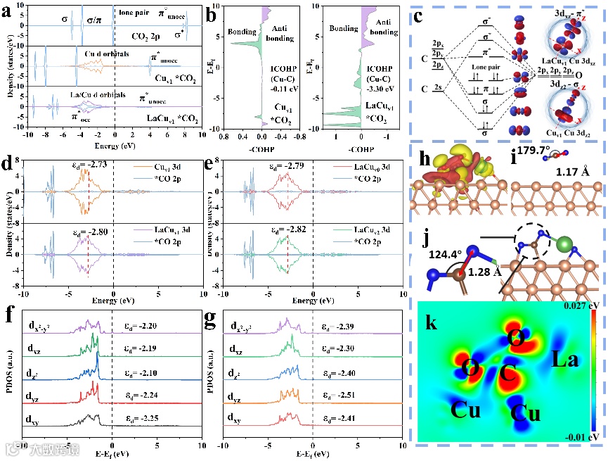 图5. DFT计算结果。a) Cuv1和LaCuv1表面吸附CO2的投影态密度(PDOS)与自由态CO2分子的对比,虚线表示费米能级;b) Cuv1和LaCuv1中Cu-C键的晶体轨道哈密顿布居(COHP)曲线;c) CO2与Cu位点的结合模式;d) Cuv1和LaCuv1上CO的d轨道投影态密度(PDOS),e) LaCuv0和LaCuv2上CO的d轨道投影态密度(PDOS),红色虚线表示d带中心(εd);f) Cuv1和g) LaCuv1上Cu 3dxy、3dyz、3dz2、3dxz和3dx2-y2轨道的PDOS;h) LaCuv1和i) Cuv1上*CO吸附构型的电荷密度差分;j) LaCuv1上吸附的CO2;k) LaCuv1中CO2不对称活化电荷密度差分的二维等高线示意图(黄色表示电子积累,红色表示电子耗尽,橙色球体代表Cu原子,绿色球体对应La原子,蓝色球体表示O原子)。