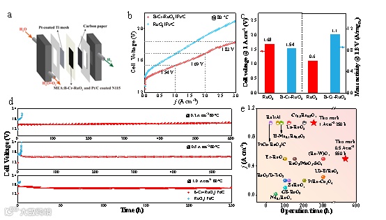 采用B-Cr-RuO2作为阳极催化剂的PEMWE在1.0 A cm-2的电密下,只需 要1.54工作电压,在0.5 A cm-2电密下,稳定运行超过500小时。