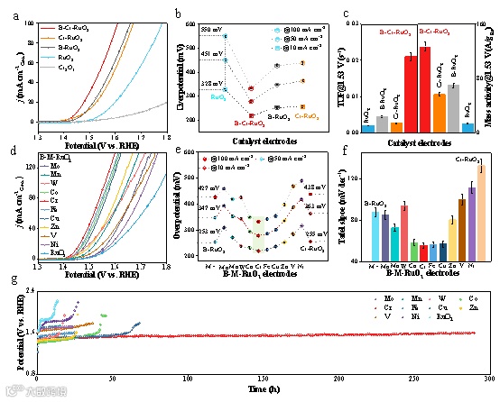 该非金属-金属策略在B-M-RuO2(M=Co、Cr、Fe、W和Cu)催化剂体系中得到了验证,具有一定普适性。该策略可拓展到其他广阔的非贵金-金属组合,如非贵金属选择 N, C等;同时也可以选择三元或多元非贵金属-金属组份,如B-Cr-Ni,B-C-Ni-Cr等,协同提高RuO2-基材料的器件稳定性。