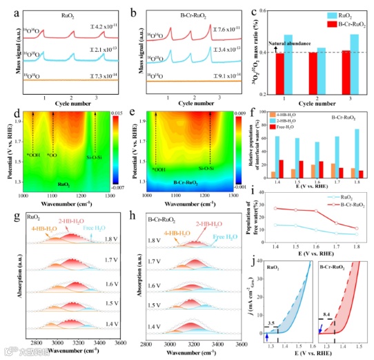 图4原位DEMS和ATR-SEIRAS分析。B-Cr-RuO2只存在AEM路径,表面OH物种提高活性水的局部浓度,提升了反应动力学。同时,表面-OH可能会增强氢键网络的连通性,促进质子转移,降低催化表面的局部pH值,利于反应动力学和结构完整性。