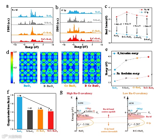 图3 理论揭示B-Cr-RuO2高稳定性的来源。B-Cr双掺杂协同使Ru 4d能带上移同时O 2p能带下移,由于单一非金属/金属掺杂,增大了Ru-O带隙。这有效削弱了Ru-O键的共价性,抑制了晶格氧的参与和 Ru的过氧化!