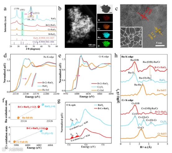 图2 结构表征。通过XRD、HR-TEM和XAS表征,揭示了 Cr 对 Ru 的电子补偿效应,B-Cr协同削弱了Ru-O共价性,抑制晶格氧的参与和 Ru的过氧化。
