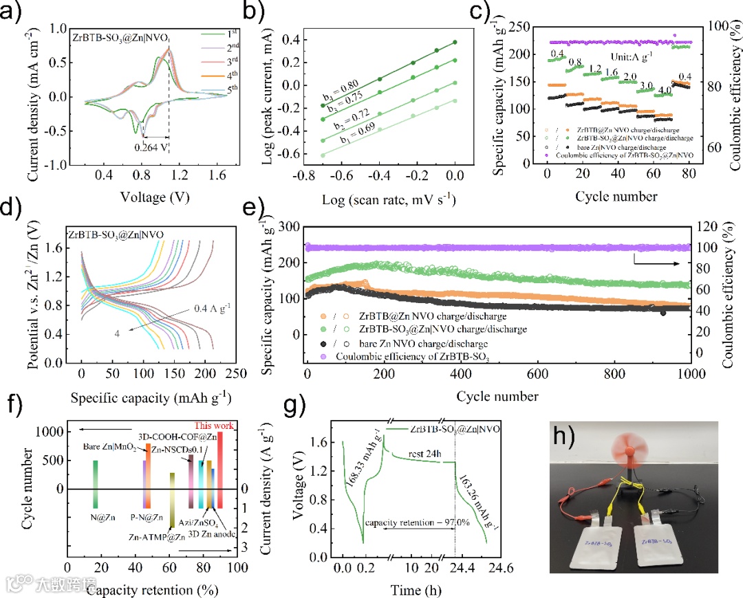 图4. a) ZrBTB-SO3@Zn|NVO 电池的 CV 曲线。b) ZrBTB-SO3@Zn|NVO 的b值计算。c) ZrBTB-SO3@Zn|NVO 电池的倍率性能和 d) 相应的充电/放电电压曲线。e) 1 A g−1 下全电池的循环性能。f) 与最近报道的具有功能化 Zn 负极的 ZIB 的循环性能比较。g) ZrBTB-SO3@Zn|NVO 电池的自放电测试。h) 为迷你风扇供电的 ZrBTB-SO3@Zn|NVO 软包电池的照片。