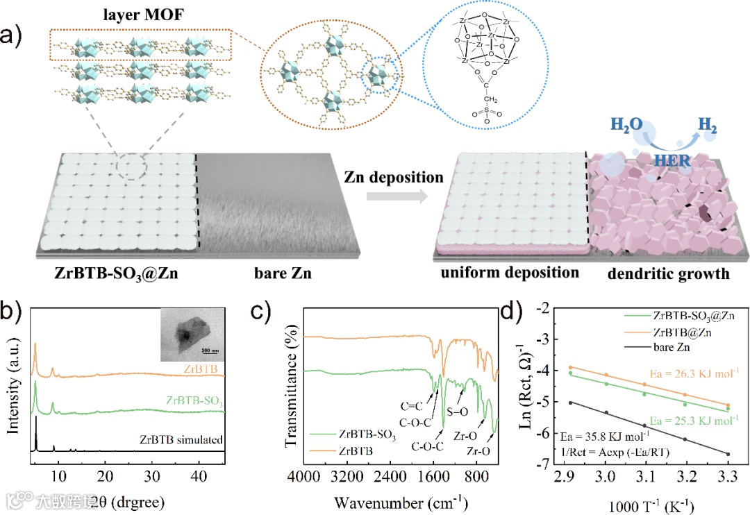 图1. a) 在锌负极上制备层状 ZrBTB-SO3 MOF 涂层的示意图。b) ZrBTB 和 ZrBTB-SO3 的 XRD 图(插图:ZrBTB-SO3 的 TEM 图像)。c) ZrBTB-SO3 和 ZrBTB 的 FTIR 图。d) Rct 与温度之间的阿伦尼乌斯关系以及计算出的 Ea。