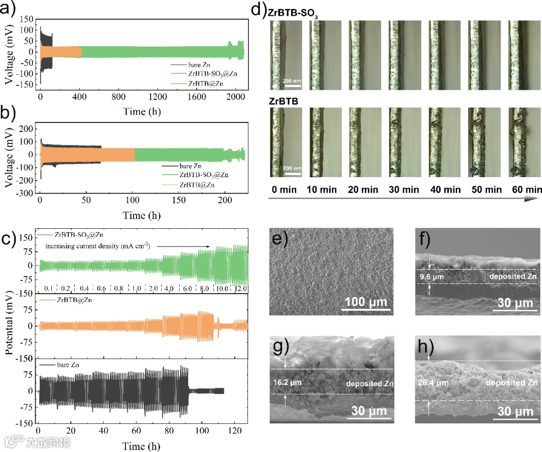 图2. a) 1mA cm−2、0.5 mAh cm−2 和 b) 5mA cm−2、2.5 mAh cm−2 条件下,裸Zn、ZrBTB-SO3@Zn 和 ZrBTB@Zn 负极的对称电池的长循环测试。c) 不同电流密度下的沉积/剥离性能。d)原位光学显微镜观察锌沉积过程。e) 沉积量为5 mAh cm−2的 ZrBTB-SO3 涂层的 SEM 图像。沉积量为5 mAh cm−2 的 f) ZrBTB-SO3 涂层、g) ZrBTB 涂层和 (h) 裸铜的SEM横截面 图像。