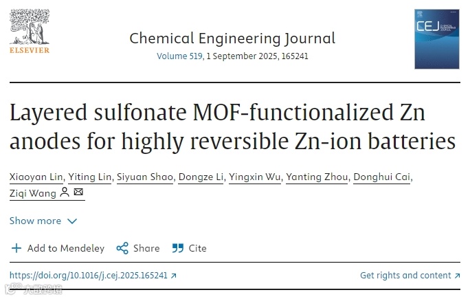 暨南大学王子奇课题组在国际知名期刊Chemical Engineering Journal上发表题为“Layered sulfonate MOF-functionalized Zn anodes for highly reversible Zn-ion batteries” 的文章。该文章通过将磺酸基团嫁接到ZrBTB MOF上制得ZrBTB-SO3 MOF作为锌负极的保护涂层,不仅能促进锌的均匀沉积,还能有效减轻副反应。