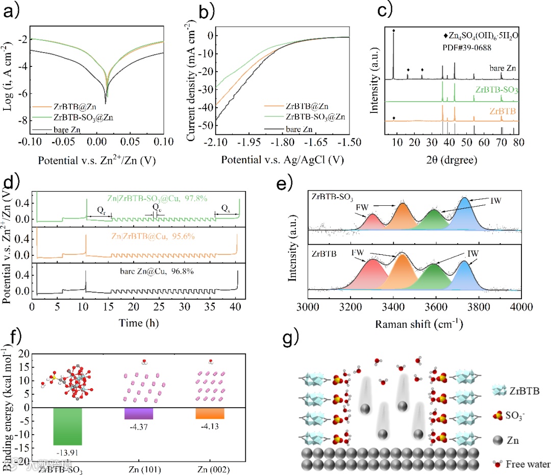 图3. a) 扫描速率为 1mVs−1 时的裸 Zn、ZrBTB-SO3@Zn 和 ZrBTB@Zn 电池的 Tafel 图。b)扫描速率为 1mVs−1 时的裸Zn、ZrBTB-SO3@Zn 和 ZrBTB@Zn 负极在 1M Na2SO4 溶液中的 LSV 曲线。c)在 ZnSO4 电解液中浸泡 5 天后的裸 Zn、ZrBTB-SO3@Zn 和 ZrBTB@Zn 负极的 XRD 图。d)Zn|ZrBTB-SO3@Cu、Zn|ZrBTB@Cu 和 Zn|Cu 电池的平均库仑效率。e)电解液润湿负极的拉曼光谱。f)自由水分子分别与 ZrBTB-SO3、Zn(101)表面和 Zn(002)表面之间的结合能。 g) ZrBTB-SO3@Zn 层通道内 Zn2+ 传输的示意图。