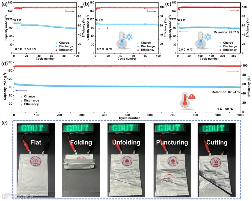 图 6. PTAFR电解质宽温域(0~60℃)性能及软包电池安全性测试