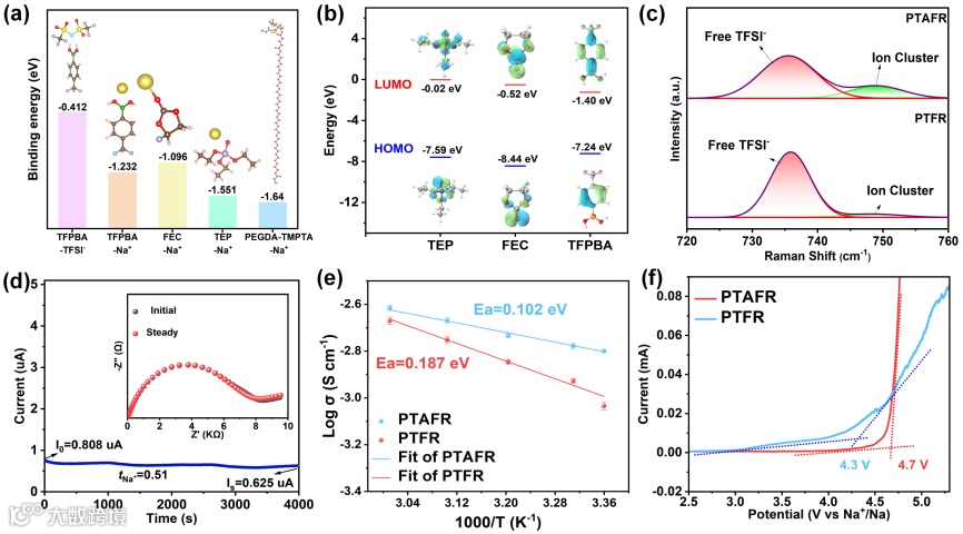 通过理论计算(图3)支撑了TFPBA对TFSI−的捕获作用。并且TFPBA具有更高的HOMO和更低的LUMO能级,说明其更容易在电极表面形成问的的界面层。相应的电化学性质表征表明PTAFR电解质的Na+迁移数达到0.51,离子电导率达到1.58 mS/cm以及电化学窗口达到4.7 V。