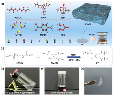 PTAFR电解质由PEGDA与TMPTA单体的C=C双键60℃热诱导聚合反应交联而成,从而显著增强了其机械强度与结构稳定性。此外,PEGDA分子中富含的含氧官能团(如C-O-C、C=O)可有效与Na+发生配位作用,从而在聚合物基体中构建连续的离子迁移通道,提升Na+的迁移效率并赋予电解质优异的离子电导率。