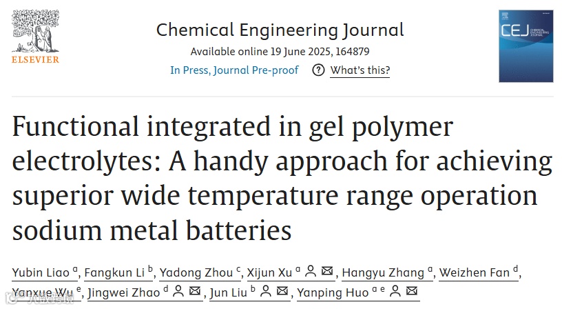 广东工业大学霍延平教授、许希军副教授,华南理工大学刘军教授,广州天赐赵经纬高级工程师等联合开发了一种阻燃凝胶电解质PTAFR,用于SMBs。该电解质通过聚乙二醇二丙烯酸酯(PEGDA)和三羟甲基丙烷三丙烯酸酯(TMPTA)原位热聚合制备而成。该PTAFR在25 ℃下不仅表现出高的离子电导率(1.58 mS cm−1)和钠离子迁移数(tNa+ = 0.51),还具备宽广的电化学稳定窗口(≥4.7 V)。三乙基磷酸酯(TEP)与氟代碳酸乙烯酯(FEC)功能分子的引入增强了阻燃性能,并促进稳定固态电解质界面膜的形成。Na/PTAFR/Na对称电池在0.1 mA cm−2电流密度下可实现超过2000小时的稳定沉积/剥离行为。此外,组装的 NVP/PTAFR/Na 电池在2 C倍率下循环5000圈后仍能保持98.9 mAh g−1的容量,容量保持率高达86.57%。值得注意的是,该类钠金属电池在0℃和60℃条件下分别展现出88.3 mAh g−1(0.5 C)和92.1 mAh g−1(1 C)的优异性能。这种针对性功能集成策略为设计安全、低成本和长寿命的钠金属电池提供了指导。相关工作以“Functional Integrated in Gel Polymer Electrolytes: A Handy Approach for Achieving Superior Wide Temperature Range Operation Sodium Metal Batteries”为题发表在Chemical Engineering Journal 期刊上。