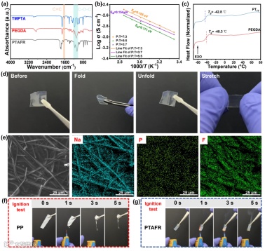 傅里叶变换红外光谱(FTIR)结果中,热引发聚合后,PTAFR 中 1630 cm⁻¹ 处的 C=C 双键特征峰消失,而 C=O 和 C–O–C 等特征峰仍存在,验证了PEGDA 和 TMPTA 通过 C=C 双键发生聚合。对比不同配比后发现,PT73 具备较高的离子电导率和较低的 Na⁺ 迁移活化能。DSC 测试表明PT73 具有更低的玻璃化转变温度(Tg:-42.8℃)。阻燃测试表明进一步引入功能分子三乙基磷酸酯(TEP)和三氟甲基苯硼酸(TFPBA),有效提升了电解质的阻燃性能。SEM 证明了前驱体溶液可渗入玻璃纤维隔膜中并原位聚合,且 Na、P、F 元素在电解质中分布均匀。