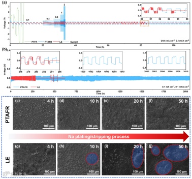 组装的Na//Na对称电池,并在 0.1 至 2.0 mA cm−2 不同电流密度下,展现了优异的稳定性。使用PTAFR组装的Na//Na对称电池展示了超过2200小时的稳定钠沉积/剥离性能,证明了PTAFR与钠金属良好的界面稳定性。SEM表征进一步表明使用PTAFR电解质的钠金属表面出现更均匀和致密的Na沉积形态。