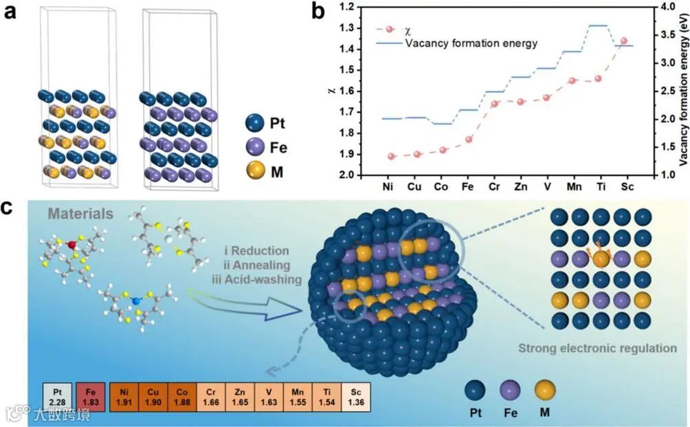 图1. PtFe与PtFe0.5M0.5(M 为3d过渡金属)的结构构型,揭示Fe + M空位形成能与电负性的关联