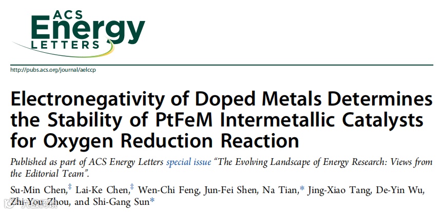近日,来自厦门大学的田娜教授与孙世刚教授在国际知名期刊ACS Energy Letters上发表题为“Electronegativity of Doped Metals Determines the Stability of PtFeM Intermetallic Catalysts for Oxygen Reduction Reaction”的观点文章。该观点文章发现三元PtFeM催化剂稳定性由掺杂过渡金属M的电负性决定,低电负性的M可抑制金属溶出,确立电负性为催化剂稳定性的关键描述符。