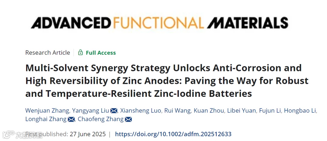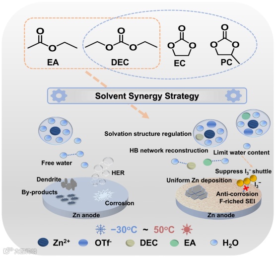 近日,安徽大学张朝峰、张龙海、刘洋洋团队在Advanced Functional Materials期刊发表题为“Multi-Solvent Synergy Strategy Unlocks Anti-Corrosion and High Reversibility of Zinc Anodes: Paving the Way for Robust and Temperature-Resilient Zinc-Iodine Batteries”的研究论文。该研究开发了一种包含碳酸二乙酯(DEC)、乙酸乙酯(EA)和H₂O的三元共溶剂电解质,有效解决了上述问题。