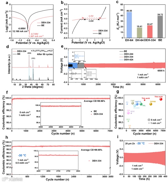 图5. 锌沉积行为的电化学表征。a) DEH-334和BE的塔菲尔曲线。b) 三电极电池在1 mV s⁻¹下测得的DEH-334和BE的整体电化学稳定窗口。c) DEH-334和BE中Zn²⁺在负极/电解质界面扩散的活化能(Eₐ)。d) DEH-334和BE中锌负极在1 mA cm⁻²和1 mAh cm⁻²下循环50次后的XRD图谱。e) 不同电解质组装的Zn||Zn对称电池在1 mA cm⁻²和1 mAh cm⁻²下的循环性能。f) DEH-334和BE组装的Zn||Cu电池在5 mA cm⁻²和1 mAh cm⁻²下的性能。g) 与已报道电解质的循环次数和平均库仑效率(ACE)对比。h) DEH-334和BE组装的Zn||Cu电池在-30°C、1 mA cm⁻²和0.5 mAh cm⁻²下的性能。i) DEH-334组装的Zn||Zn对称电池(20 μm Zn)在-30°C、1 mA cm⁻²和1 mAh cm⁻²下的循环性能。