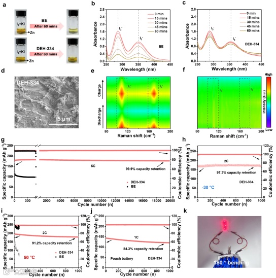 图6. 全电池的电化学性能。a) 锌箔浸泡在含I₃⁻溶液的BE和DEH-334中的数码照片及b,c) UV-vis吸收光谱。d) DEH-334组装的Zn||I₂电池循环后锌负极的SEM图像。e,f) 采用BE和DEH-334的Zn||I₂电池的原位拉曼光谱。g) DEH-334和BE组装的Zn-I₂电池在5 C下的长期循环性能。h) DEH-334组装的Zn||I₂电池在-30°C、2 C下的长期循环性能。i) DEH-334和BE组装的Zn||I₂电池在50°C、2 C下的长期循环性能。j) DEH-334组装的Zn||I₂软包电池在1 C下的长期循环性能。k) 柔性Zn||I₂软包电池在180°弯曲下为湿度计供电的光学照片。