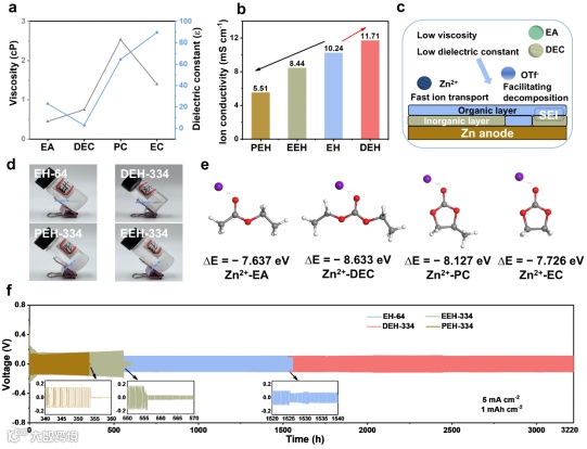 图2. 酯类电解质组合的筛选。a) 不同溶剂的黏度与介电常数值。b) 不同电解质在25°C下的离子电导率。c) DEH电解质中锌负极表面阴离子衍生SEI的示意图。d) 不同电解质在-50°C下放置1小时后的光学照片。e) Zn²⁺-EA、Zn²⁺-DEC、Zn²⁺-PC和Zn²⁺-EC的结合能计算值。f) 不同电解质组装的Zn||Zn对称电池在5 mA cm⁻²和1 mAh cm⁻²下的循环性能。