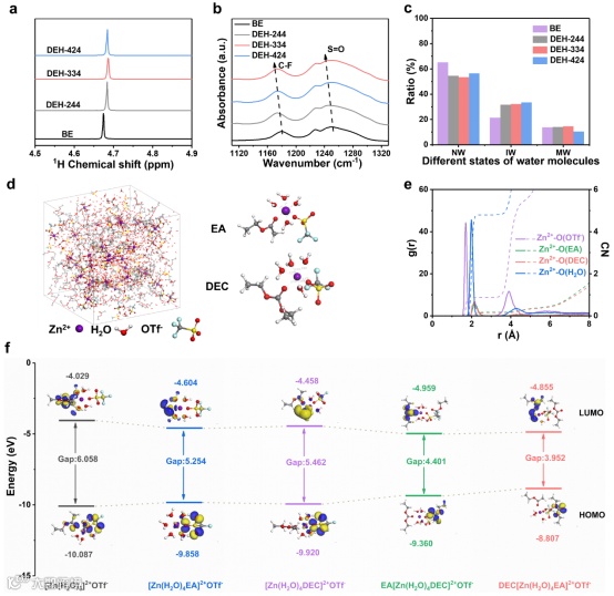 图3. 最优酯类电解质组合的表征。a) 不同电解质的¹H NMR谱图。b) 不同电解质中C-F和S=O的FTIR信号。c) 通过FTIR信号分析不同电解质中强氢键、弱氢键和无氢键水分子的比例。d) DEH-334中Zn²⁺的MD模拟快照及代表性溶剂化结构。e) Zn²⁺-O(OTf⁻)、Zn²⁺-O(EA)、Zn²⁺-O(DEC)和Zn²⁺-O(H₂O)的径向分布函数(RDFs)。f) 不同溶剂化结构的LUMO和HOMO能级。
