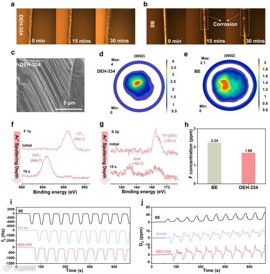 图4. 锌沉积行为的物理表征。a,b) DEH-334和BE中锌负极在1 mA cm⁻²下0、15和30分钟时的原位光学显微镜观察快照。c) DEH-334中1 mA cm⁻²下循环50次后锌沉积物的SEM图像。d,e) DEH-334和BE中锌负极在1 mA cm⁻²和1 mAh cm⁻²下循环后的(0002)极图。f,g) DEH-334中锌电极循环50次(1 mA cm⁻²和1 mAh cm⁻²)后F 1s和S 2p的XPS谱图(Ar⁺溅射时间0和15秒)。h) 以DEH-334和BE为溶剂时饱和ZnF₂溶液中氟元素的浓度。i,j) 采用BE、EH-64和DEH-334电解质时,谐振电极频率变化(f₃)和归一化耗散(D₃)随时间的变化。