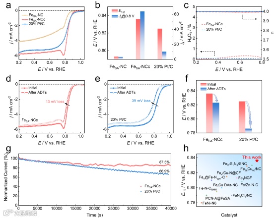电化学数据证实FeSA-NCc具有优异的ORR催化性能。其半波电位显著优于商业Pt/C催化剂(0.836 V vs. 0.825 V)RRDE测试进一步显示,FeSA-NCc在0.2-0.8 V电位区间内H2O2产率低于1%,电子转移数接近4,表明其遵循四电子转移路径。此外,FeSA-NCc催化剂经过30000圈ADT测试后的半波电位仅衰减13 mV,远低于20% Pt/C(39 mV),证实其弯曲Fe-N4结构兼具高活性和高稳定性。